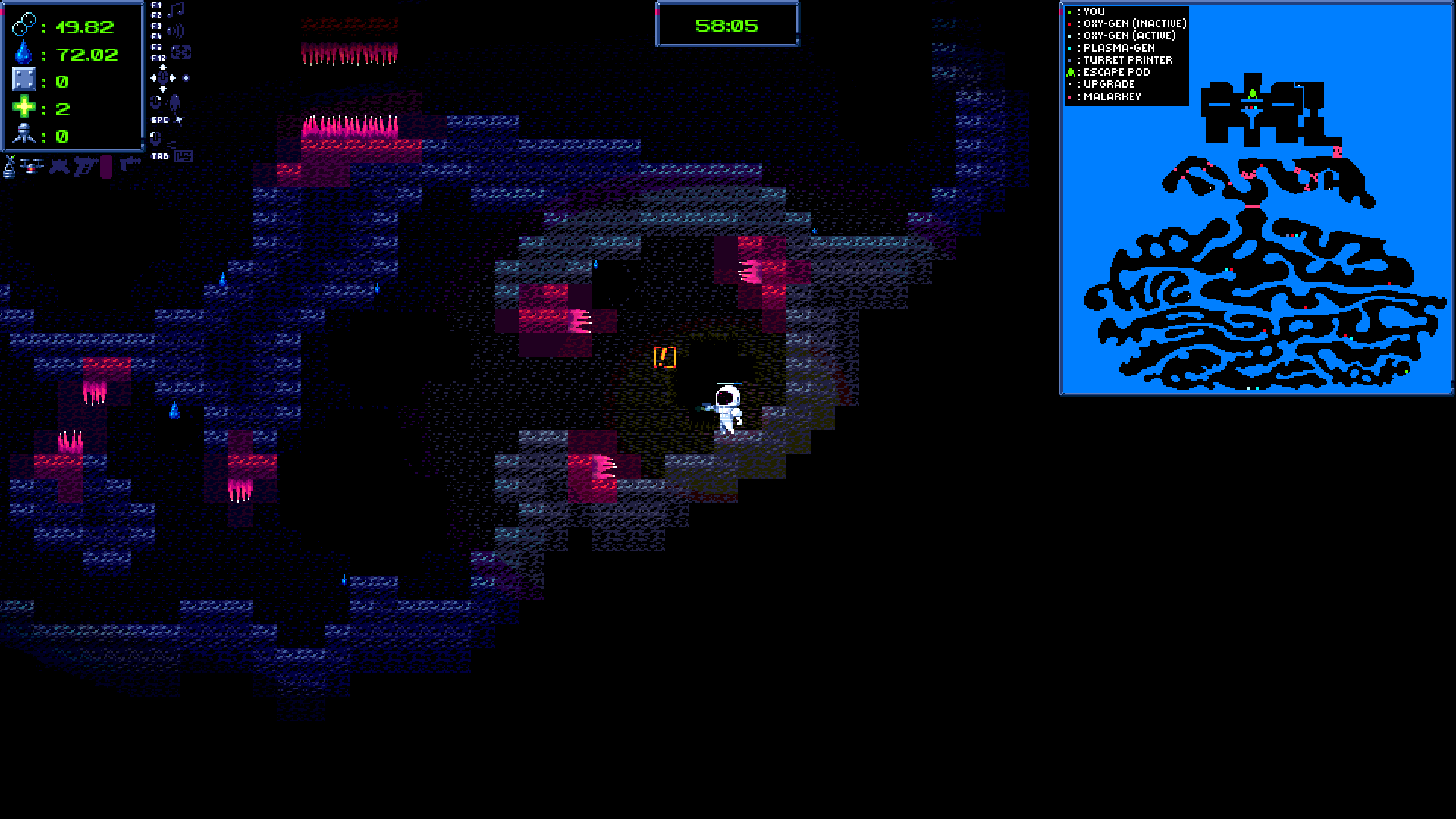 You're an astronaut, stranded inside of Oumuamua, as you crashed into it with your space station when it's crossed our solar system. Your only hope to survive is to find the Oxy-generators - you consume oxygen and use it to propel yourself around. Collect resources (water and scrapmetal), craft plasma and turrets, find upgrades and finally build an escape pod to leave this forsaken place. You have an hour to do it: Oumuamua will leave the solar system soon, taking you over the point of no return.